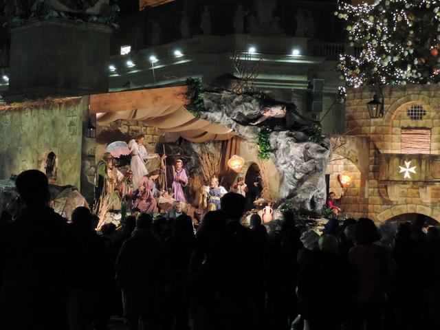 ↑ バチカン市国のサン・ピエトロ大聖堂の法王様のクリスマスツリーと、プレゼピオ(キリスト降誕の場面を人形で表現した模型)です。