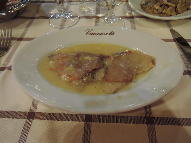 こちらはローマのレストランにはよくあるメニューで、メインデッシュのローマ風サルティンボッカ(薄切りの仔牛肉に、プロシュット(または生ハム)セージの葉を巻き上げたものを、マサラ酒や白ワインとバターで仕上げたもの)を注文しました!