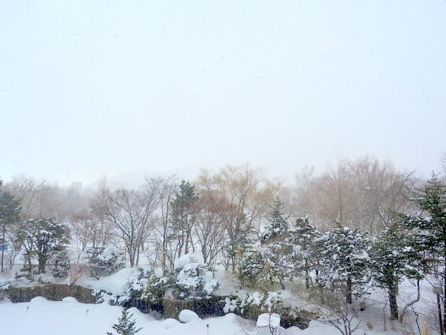 吹雪と晴れを繰り返し、窓からの眺望はモノトーン。