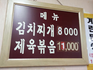 このお店のメニューは、キムチチゲ(8000ウォン)と