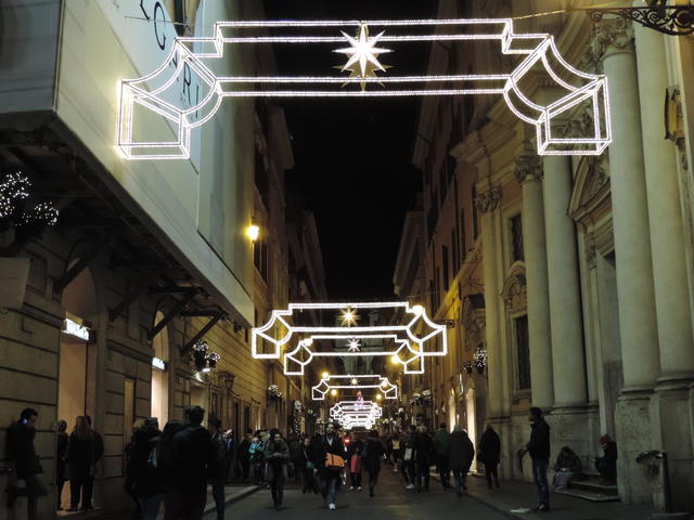 ↑ 続いて、ヴィットリオ・エマヌエーレ2世通りに行きました。ヴィットリオ・エマヌエーレ2世通りはバチカン市国方面へ架かるヴィットリオ・エマヌエーレ2世橋とヴェネツィア広場近くを結ぶ通りです。大雑把に言うと、コルソ通りは南北に走る通りですが、こちらのヴィットリオ・エマヌエーレ2世通りは東西に延びています。写真のイルミネーションは、カンポ・デ・フィオーリ市場方面へ入る道の一つです。