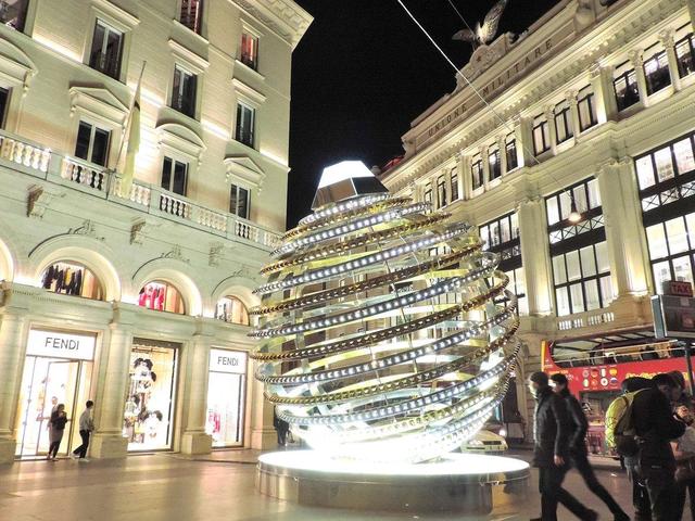 ↑ ポポロ広場とヴェネツィア広場を結ぶコルソ通りに面した、高級ファッションブランドのフェンディ(FENDI)本店前のイルミネーションです。激しく光っています!この場所はラルゴ・カルロ・ゴルドーニ(Largo Carlo Goldoni)と言い、この広場に延びるコンドッティ通りを真っすぐ行けば突き当りはスペイン広場です。場所柄、人通りが大変多い為、撮影するのにとても苦労しました。