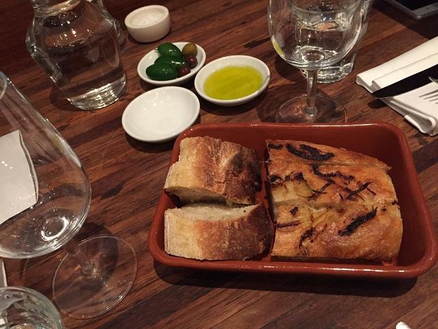 まず着席してからドリンクを頼んだら、焼きたてで味わい深いパンやオリーヴが出てきました。ワインで乾杯してからパンを頂きつつ、ゆっくりメニューを検討して・・・。