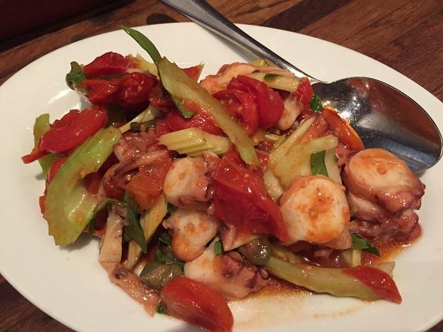 まずはタコ。ロースト・トマトやセロリ、バジルと共にあえた、シチリア風の一品は、柔らかいタコに絶妙な味付け。最初の一皿が美味しいと、その後の期待も高まりますよね!