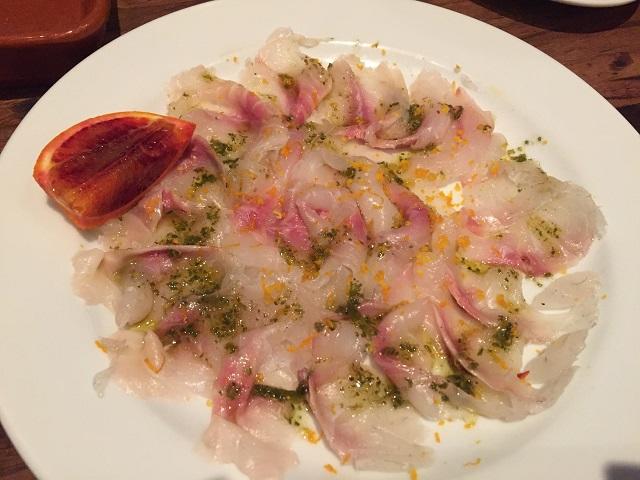 こちらは鯛の一種、シーブリームのカルパッチョ。新鮮な魚に、添えられたブラッド・オレンジを絞りかけて、爽やかな風味を堪能しました。う~ん、むちゃくちゃ美味しい!!!するとワインも益々すすんでしまうのが、ちょっと困りもの。笑