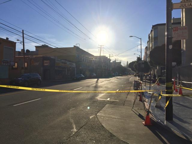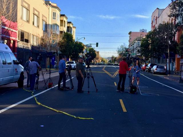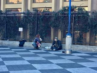 Keep Outの黄色ロープから少し離れた場所では、女性が自らカメラを回しホームレス(らしい人)に一所懸命インタビューしている。 たった1ブロックされど1ブロック。