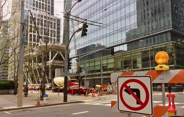 ミッション(Mission)通りとビール(Beale)通りカリフォルニア高速鉄道のターミナル駅建設中につき週末はこのように道路を封鎖して突貫工事なのだ。