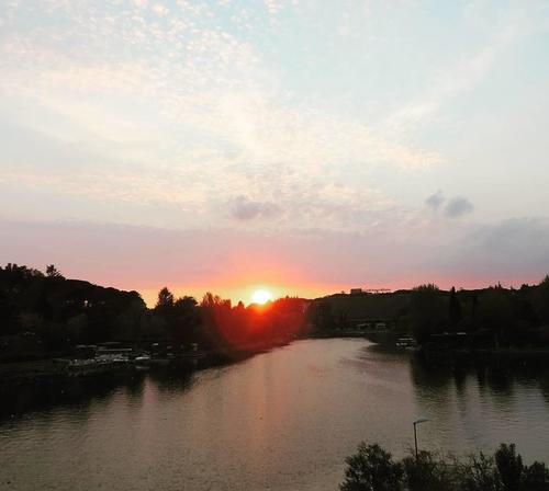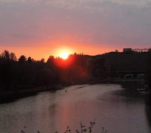 ↑ 日本の散歩道を半周したら日没となりました。湖の真ん中を走るクリストフォロ・コロンボ通りの橋の上から見ると自分の真正面に太陽が沈んで行く形となるので、橋の上から見てみました。時々大きな魚が水面のあちこちで跳ねているのが良く見えました。魚は何故、あの様に飛ぶのでしょうか?