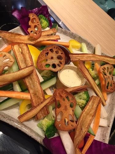 バーニャカウダー、生野菜と野菜チップスをディップしていただきます。