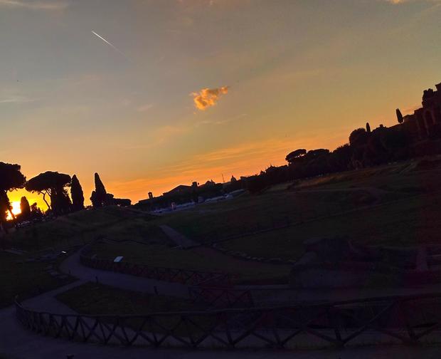 ↑ 古代の戦車競技場のチルコ・マッシモは600メートルの長さがあります。現在は空き地ですので、中で体操をしている人や走る人も多くいます。昨日の夕焼けです。斜めになっているのは、知らない間にスマホがカバンの中で勝手に撮影してくれたからです。しかし綺麗だったので載せます。茜色のグラデーションを持つ空の中をゆっくりと飛んで行く飛行機です。飛行機の中からはどの様な夕日が見えるのでしょうか!