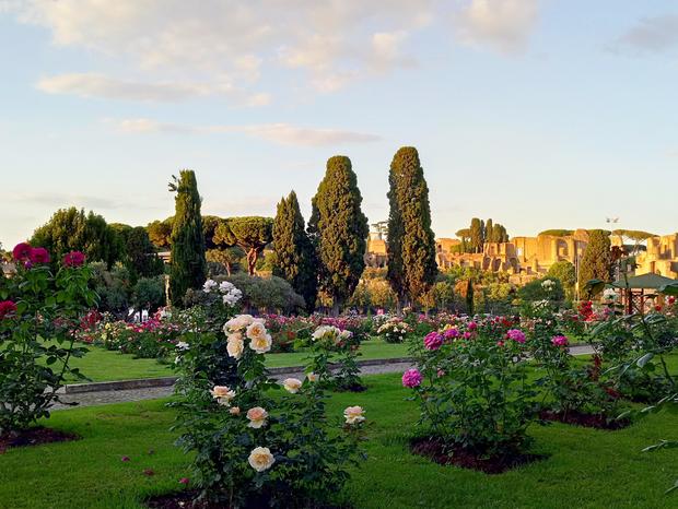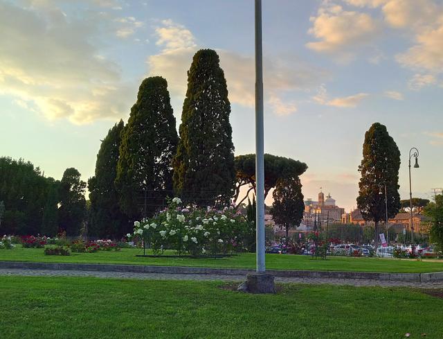 ↑ 古代遺跡をバックにしてバラ園を撮影すると、とても素敵な写真が出来上がります!遺跡が夕焼けに照らされてオレンジ色になっています。ローマの今日の日没時刻は20時27分でした。遅くまで明るいです。