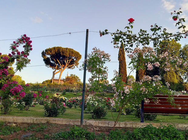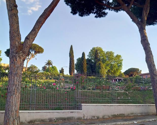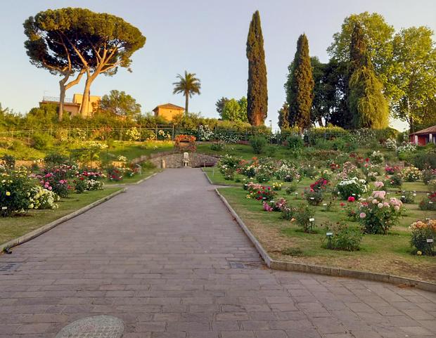 ↑ こちらは、より見応えがある南側のバラ園です。周りに植栽されている木々も、ローマらしいエキゾチックな雰囲気を作り上げています。