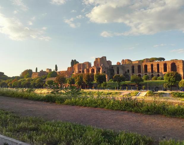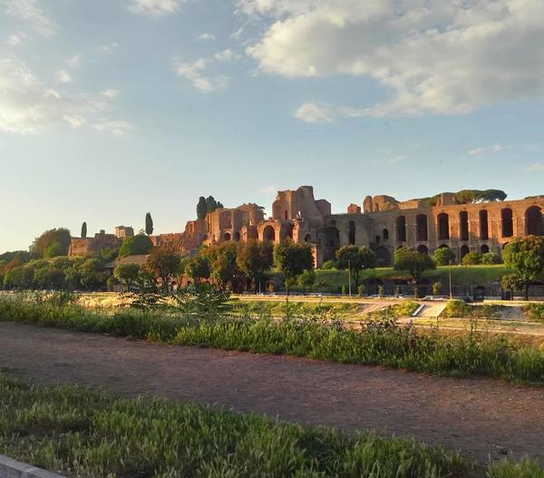 ↑ バラ園の前にあるチルコ・マッシモです。夕日が射しています。写真の遺構は、チルコ・マッシモに面しているパラティーノの丘の皇帝達の住居跡です。