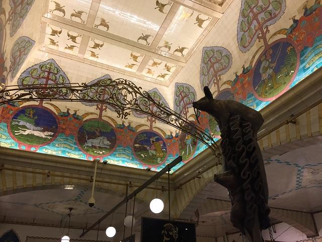 お肉売り場のガラスには孔雀・・・その周囲のタイル絵なども凝っています。