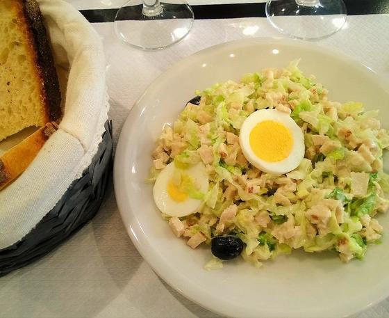 ↑ 続いておかず類です。こちらもマンマ手作りの鶏肉とレタスと黒オリーブのサラダと、ナスのモッツァレラチーズとアンチョビサンドです。衣を付けたナスの間にチーズとアンチョビを挟んだナスのサンドイッチです。この二つはたんぱく質が摂れるメニューです。サラダをお皿に盛る時に、ゆで卵のスライスものせてくれます。