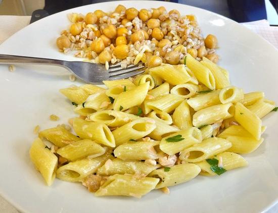 ↑ 家の近所のバールで夏に良く見るメニューです。手前がスモークサーモンのペンネで、奥がヒヨコ豆と小麦のご飯です。ご飯の中には小さく刻んだ玉ねぎと人参が入っていました。色々バリエーションがある様です。麦も良く食べられます。