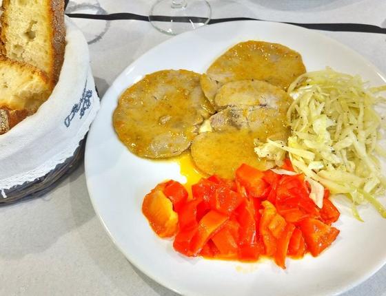 ↑ こちらは子牛の人参ソース煮込み、キャベツと黒コショウのサラダ、赤ピーマンの炒め物です。イタリアの方はパンがないとお食事が出来ませんので、この様にカゴに入ったパンやグリッシーニなどがサービスで付いて来ます。