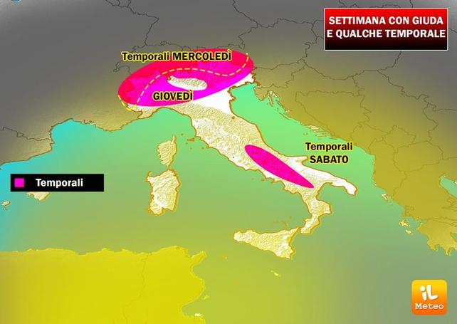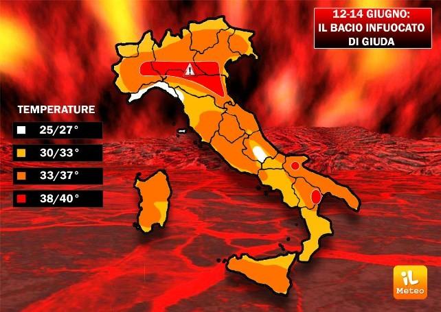 アフリカからの高気圧”ユダ”がイタリア半島に到着した模様です。予報によると、ユダの身を焦がすような灼熱のキスにより、本日から16日まではイタリア半島では気温が40度まで上昇する地域もあります。これは今年に入って一番の暑さとなり、熱中症などに特に注意すべき週として案内が出ています。