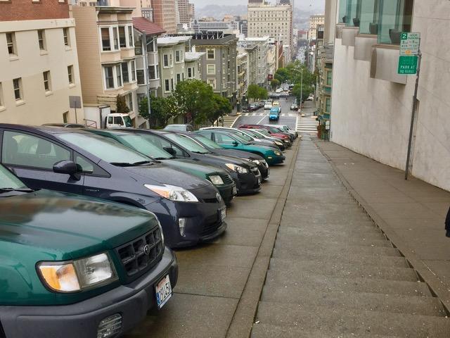 『90度の角度で駐車(PARK AT 90 DEGCREES)』 ここからの坂道発進している車は切なすぎてとてもカメラに収められなかった。 思わず「頑張れ、車!」と言いたくなる。 カリフォルニア&テイラー(California ST & Taylor ST)雨の日は絶対避けたい登り坂だ。