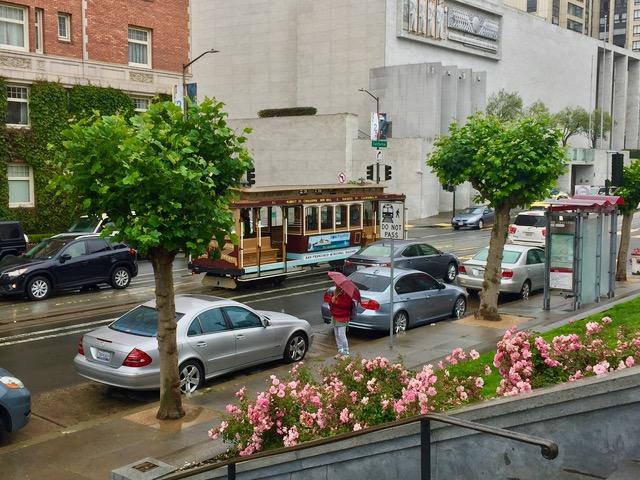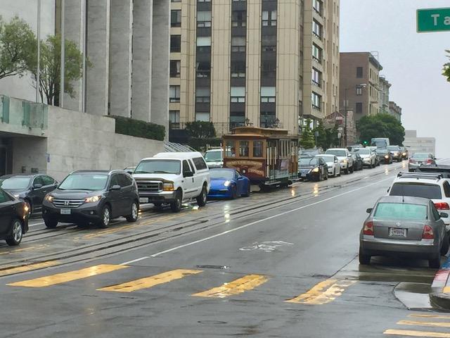 とにかく、雨に慣れていないので渋滞はいつもより酷い!! ジュリジュリ〜〜っと坂道発進でタイヤがアスファルトの上を滑ってる音。 キュリキュリ〜ってのはケーブルカーの線路の上で滑る音。 いろんなスリップ音がサンフランシスコにはある。 ケーブルカーも渋滞に巻き込まれてるけど、微妙な傾斜はグリップマンの技術が求められる。