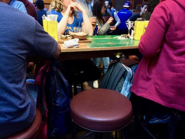 混雑している最中、こうして一つだけ椅子がある。 お連れの方がなかなか戻ってこない。その感いろんな人に空いてるか聞かれその度に連れがいると言い続け、表情も徐々に険しくなり周囲と話もできず、ただひたすらテレビを見つめ、ウォリアーズと同じように非常に形勢不利な彼女だった。