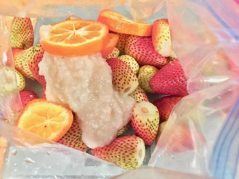 イチゴは洗って軽く拭いといてヘタ取ります、金柑輪切り。 これをジップロックに入れ重さの半分の量の三五八漬けの素を加える。 軽く揉み込み冷蔵庫。