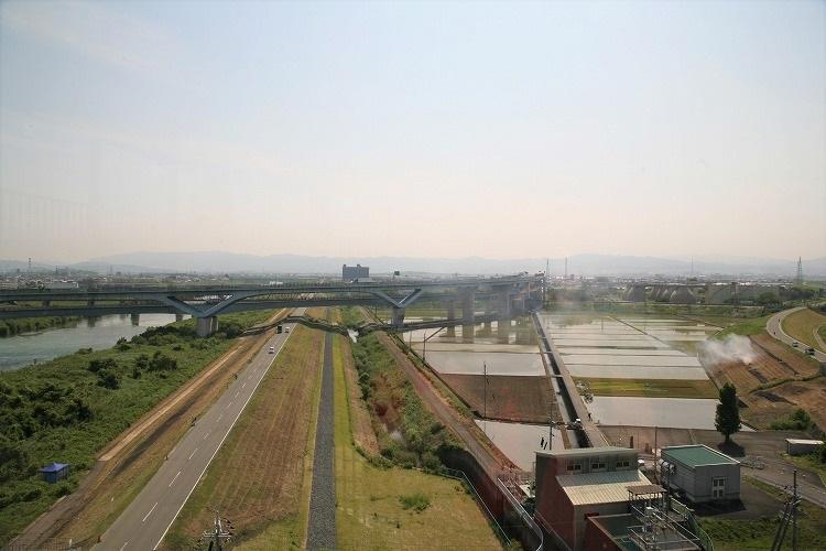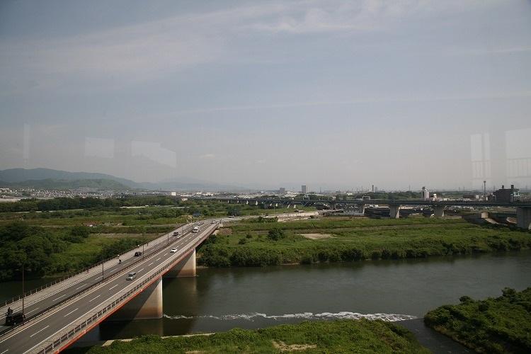 正面に見えるのは、桜の名所、背割堤。