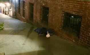 いつもと同じ場所にホームレスさん就寝(今夜は誰かからの差し入れあり)