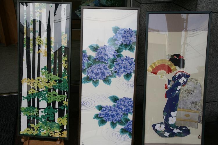 お店前に飾られた、青もみじ・紫陽花・舞妓さんの手ぬぐいが素敵です。