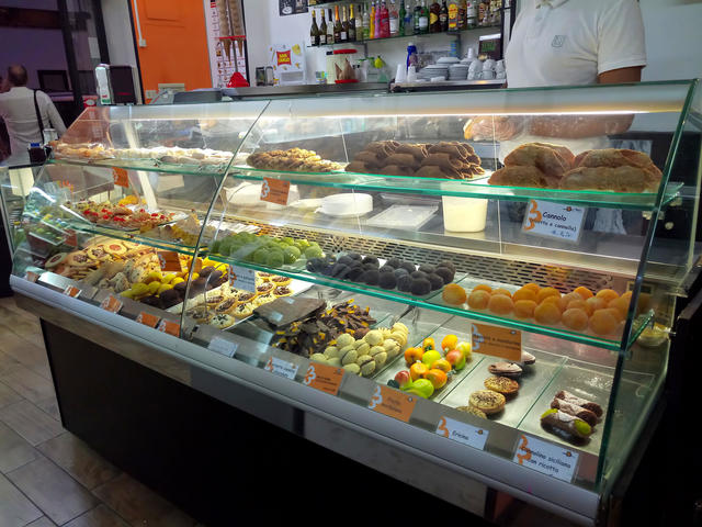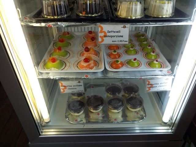 ↑ シチリア島名産のカッサータ(Cassata)などの冷たいお菓子も少しあります。このお店はコーヒーなどの飲み物も注文できるので、普通のバール感覚で使えるお店です。