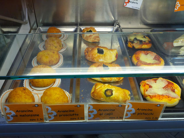 ↑ パンなどの塩辛いもののコーナーもあります。これらもシチリア島の食べ物で、一番左に見えるのはライスコロッケです。トマトソース(ミートソース)で煮たお米の中にはモッツアレラチーズ、ひき肉、ナスなどが入っています。バリエーションは様々です。