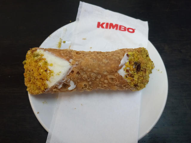 ↑ カンノーロを食べて帰ります!中には冷たいリコッタチーズのクリームが詰められました。暑い夏にぴったりです。左右には、ピスタチオを細かく砕いたものを付けてあります。写真だと分かりにくいですが、大きいです。筆者の手の平位(15センチ位?)の代物です。