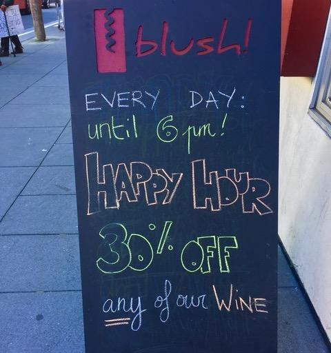 『ブラッシュ(Blush!)』は、カストロ地区ど真ん中にあって、市内おすすめハッピーアワープレイスでよく紹介されている。 場所柄ちょっと素敵なお兄さんたちが多いだけで、もちろん普通のワインバーなのである。