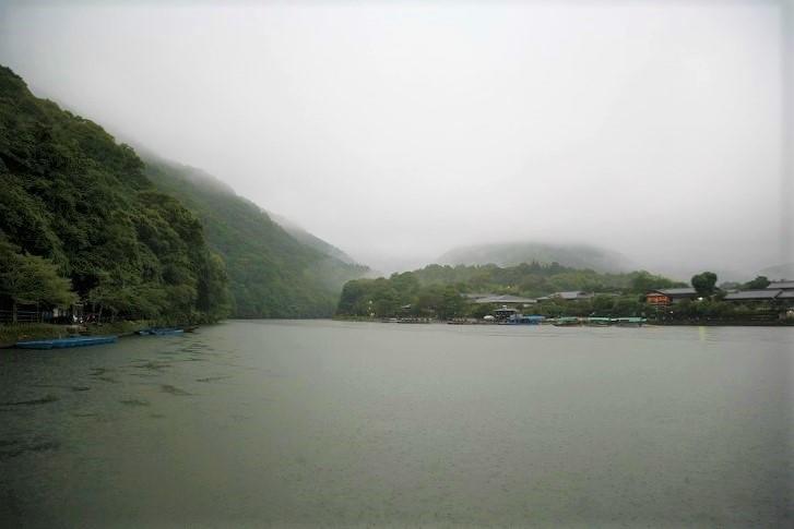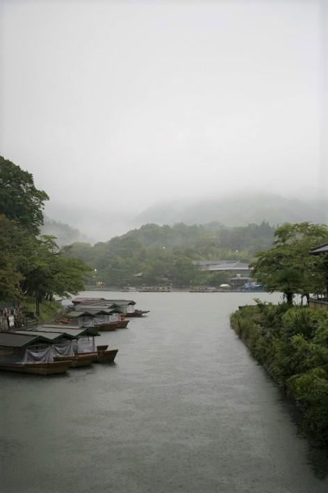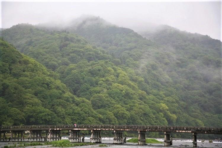 昨夜からの激しい雨で、早朝の嵐山は霧が降りていました。