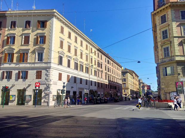 ↑ オッタヴィアーノ通り(奥へ延びる道)とジューリオ・チェーザレ通り(左右に走る道)の交差する場所の地下には、地下鉄A線オッタヴィアーノ駅があります。オッタヴィアーノ通りの左右にある赤い看板の”M”と見えるところが、地下鉄駅の地上出口です。このどちらかの出口から出ると良いでしょう。