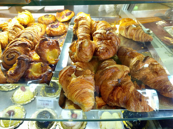 ↑ こちらは、特においしいコルネット(クロワッサン)類です。他のバールではなかなか見られない香り高いパン生地は、おそらくバターを使用していると思われます。写真の右側のものは、ホワイトチョコレートやピスタチオクリームが入っているコルネットです。その他には、各種ジャム入り、ハチミツ入りなどがあります。一番のお奨めは、ピスタチオクリーム入りのものです。