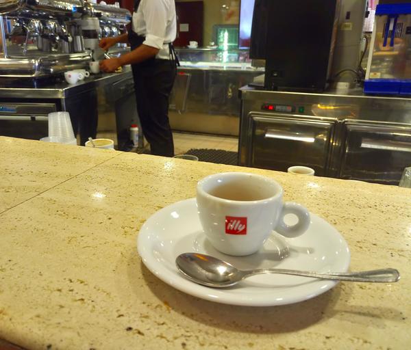 ↑ バールですので、コーヒー類もとてもおいしいです。イタリアでは、コーヒーをサービスする時には必ず温めたカップを使いますが、こちらのお店のカップは他のバールに比べるとかなり熱いです。(← この現象はカウンターで注文する時に、良く見られます)