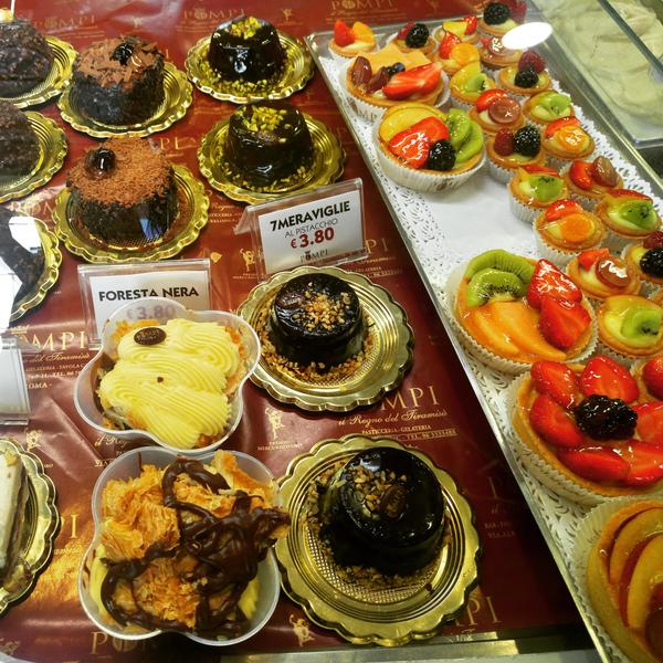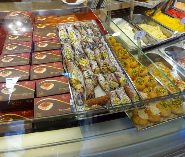 ティラミスの右隣に見えるのは、シチリア島の名物”カンノーロ”です。こちらのものもお味は悪くはないですが、ポンピの100メートル先にある”カンノーロ天国”のお店の方が、シチリア島由来のものはお奨めです。
