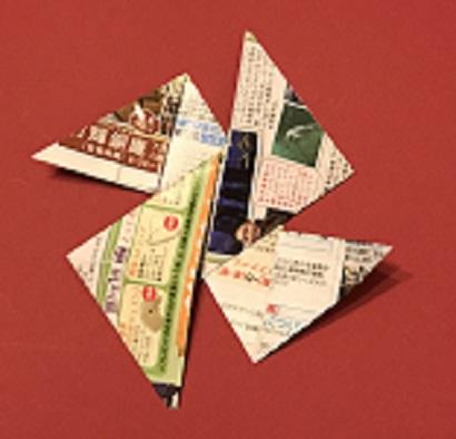 (⑨・・・最後の〔鋭角の先〕ひとつを中央に入れて折り込むと・・・やっと完成しました。)