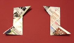 (⑦・・・⑥の工程で、下パーツ・ふたつの鋭角の先を上パーツ中央に入れ込んだ後、⑥を裏返します。)