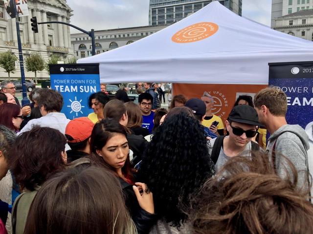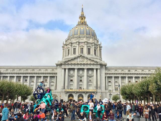 これは日食グラスをiPhoneのカメラにくっつけて撮影。 ちょうど10:15サンフランシスコでMAXにかけた時間。 実際には綺麗な三日月で線もくっきりため息が出るほど神秘的で、わずか数分でも自然観察の楽しさを十分楽しめた。 市役所は観光地にもなっていて次々観光バスが止まるけど、降りたら皆さん空を見上げてた。 イスラエルからの観光客の方にちょっとグラスを貸してあげたらとっても喜んでくれ "善い行い" をしたと嬉しくなったが、後ろ振り返ったら20人ほどのイスラエル人の列ができていた。 貸さないわけにはいかなくなった…。