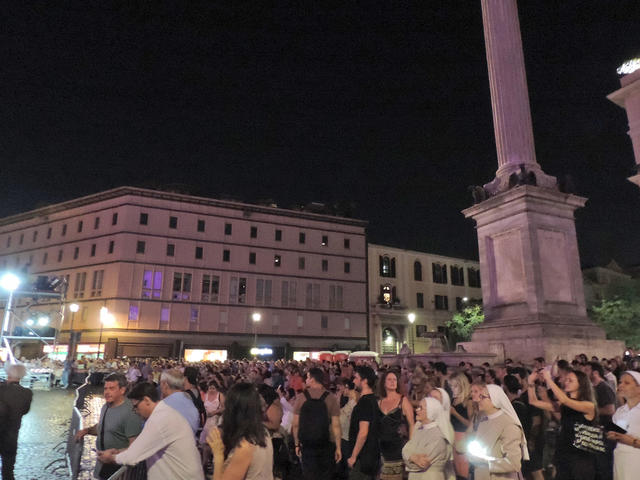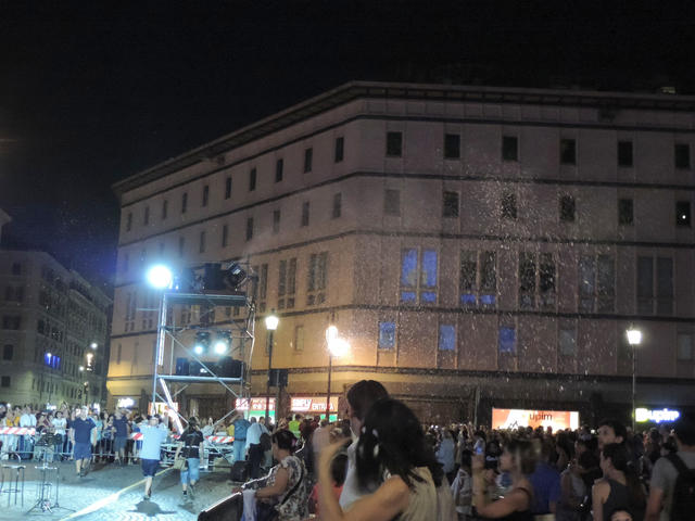 ↑ 聖堂前では沢山の人が集まっています。”奇跡の雪(Miracolo della Neve)”が降る前には、読み語りや歌謡ショーなどが催されます。