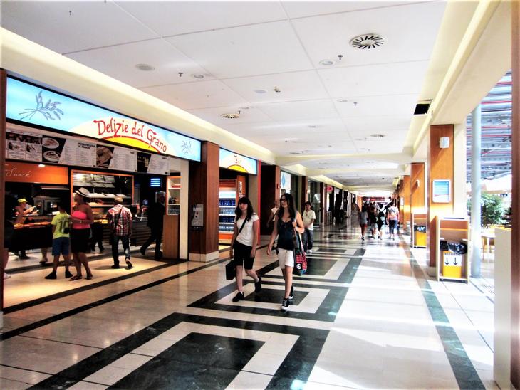 突き当りまで行くと建物内へ入る扉が!その扉を開けると、そこにはまさに田舎のショッピングモールが広がります!ショッピングモールをグングン直進し、突き当りのエスカレーターを降り館内を出れば目の前が、イータリートリノ本店!