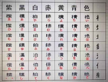 漢字の(木)、(火)、(土)、(金)、(水)、(人=亻)、(身)の7文字を⦅へん⦆にして、(色)、(青)、(黄)、(赤)、(白)、(黒)、(紫)の7文字を⦅つくり⦆に使って、その組み合わせで、独特の漢字暗号を作り上げました。