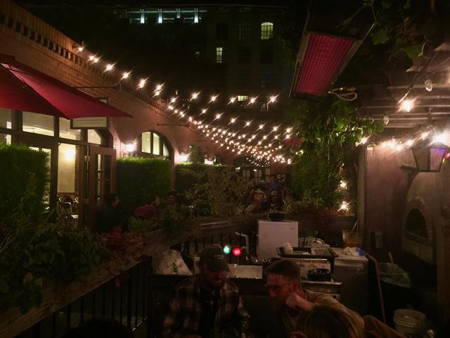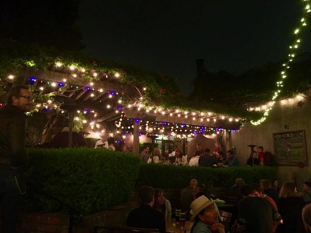 通路の奥は、パティオ(Patio)になっていて、暑い夜は屋内よりやはり屋外パティオ満席状態。 ほぼイルミネーションだけ照明でやや暗くしてるので落ち着いてついゆったりしてしまうかも。 椅子が空いていたらお互い貸し借りし合ってなんかローカル色豊か。