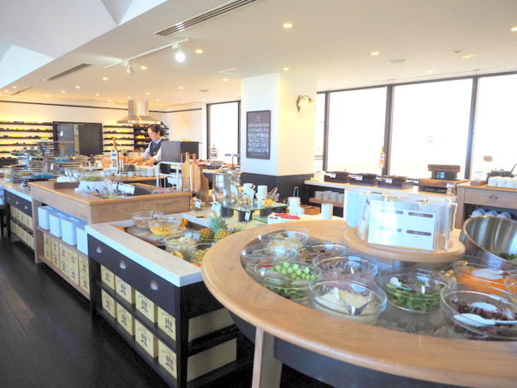 その反対側にはブッフェ料理が並んでいますが、壁ではなく、中庭に面した窓になっているので、とても明るく開放的です。