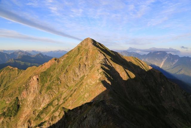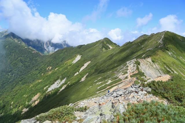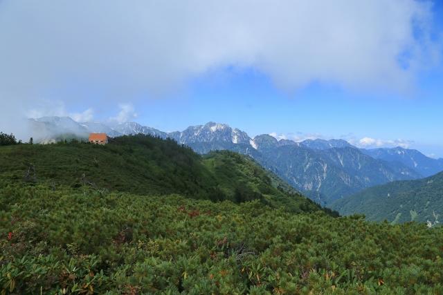 辿ってきた稜線と、遠くに穂高連峰や槍ヶ岳が見えています。