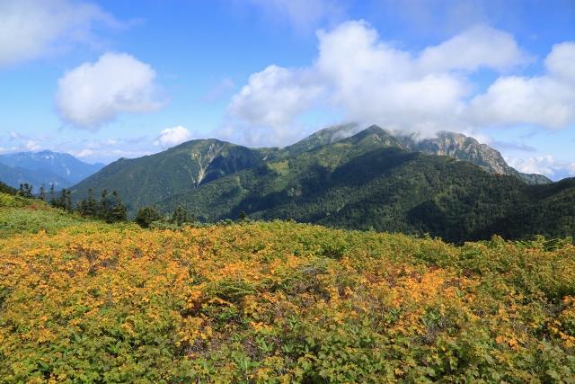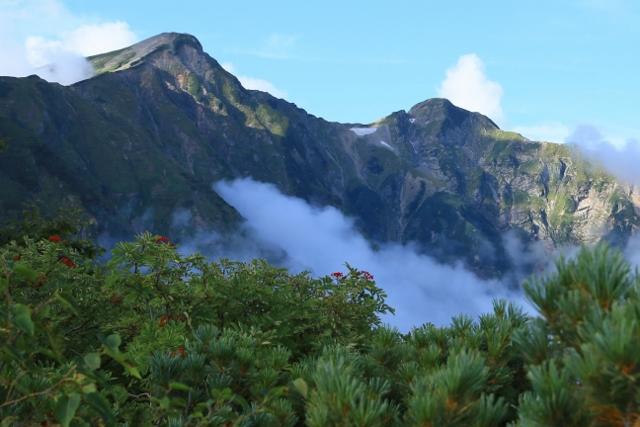 稜線から下りる前に、色付き始めたミネカエデとガスを纏う鹿島槍ヶ岳を眺めます。