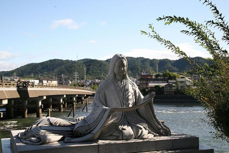 紫式部像の後に見えるのは宇治橋。宇治橋は日本最古の橋(646年)です。