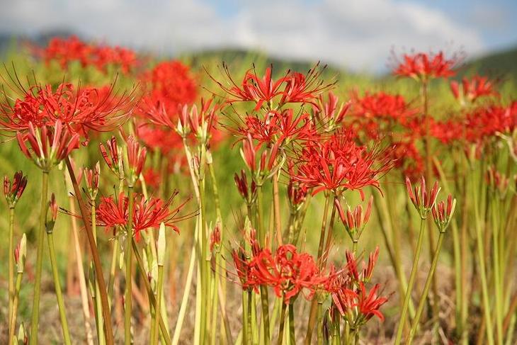 彼岸花咲く嵯峨野には、秋の景色が広がっています。